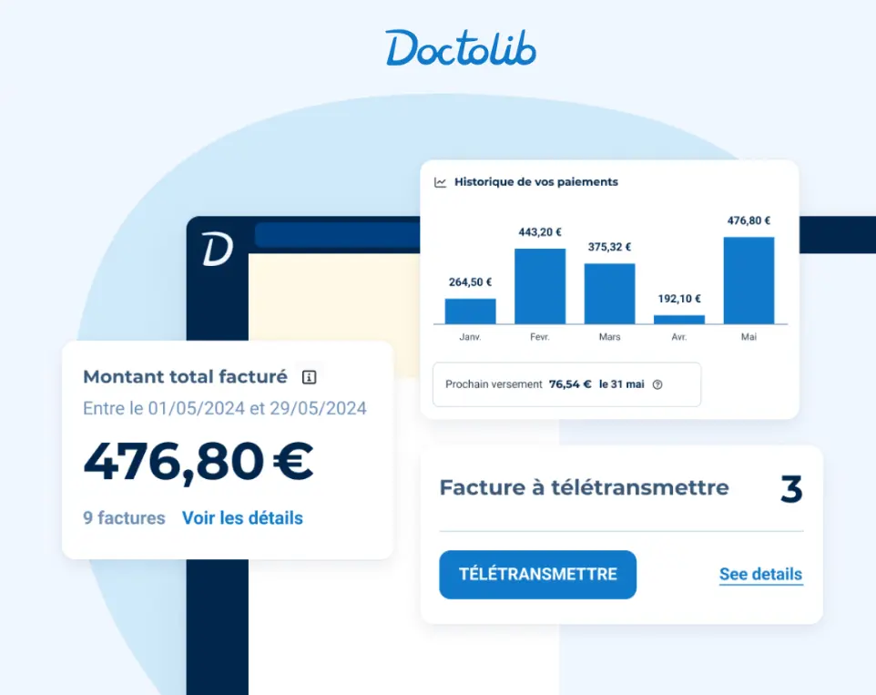 Avec le logiciel Doctolib kiné, facturez depuis votre ordinateur ou votre téléphone et soyez pleinement rémunéré pour votre travail.